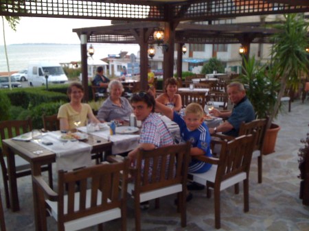 The beauty of St. Vlas’s location just half an hour from Burgas airport is that someone can fly in and easily join us for dinner. This is exactly what happened when Sam Page flew in for a splendid week with us. Sam added to the mix of cultures around the dinner table being English; since he lives with his mother (Glyn’s ex wife) in Pinner, North West London.
