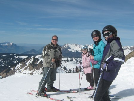 Judy had visited the chalet in February. Judy and her friends helped us discover the fantastic La Paika restaurant in the La Turche sector of Les Gets. She liked her visit so much she brought her husband Neil (an experienced skier) and children Ashleigh and Holly to the chalet just before Easter. Look at that Blue Sky!
