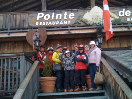 Joel Lister’s family (Nicky, Sam and Emily) came for a first experience of a chalet ski holiday over the Easter weekend. He brought Graham, Graham’s wife, Helen sometimes known as Josephine (Graham’s sister) and Remy (Helen’s boyfriend) with him. Outside the Pointe de Nyon restaurant in the Nyon sector. Alex and Rita are in there somewhere.