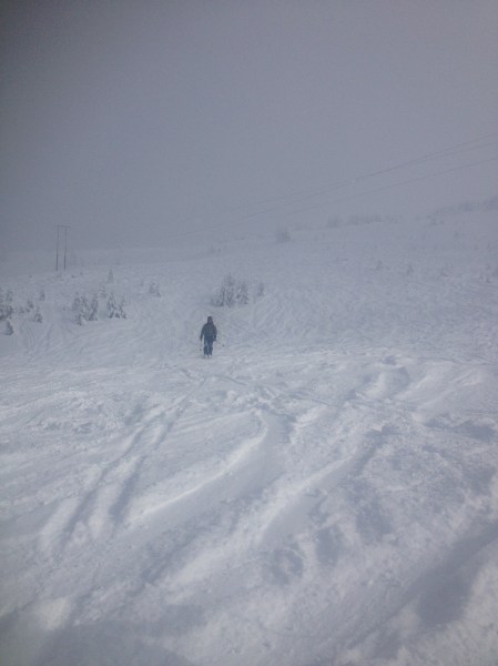 Coming out of the cloud – off piste, high above the Lindarets bowl. It was a good morning’s skiing. Well, I think it was!!