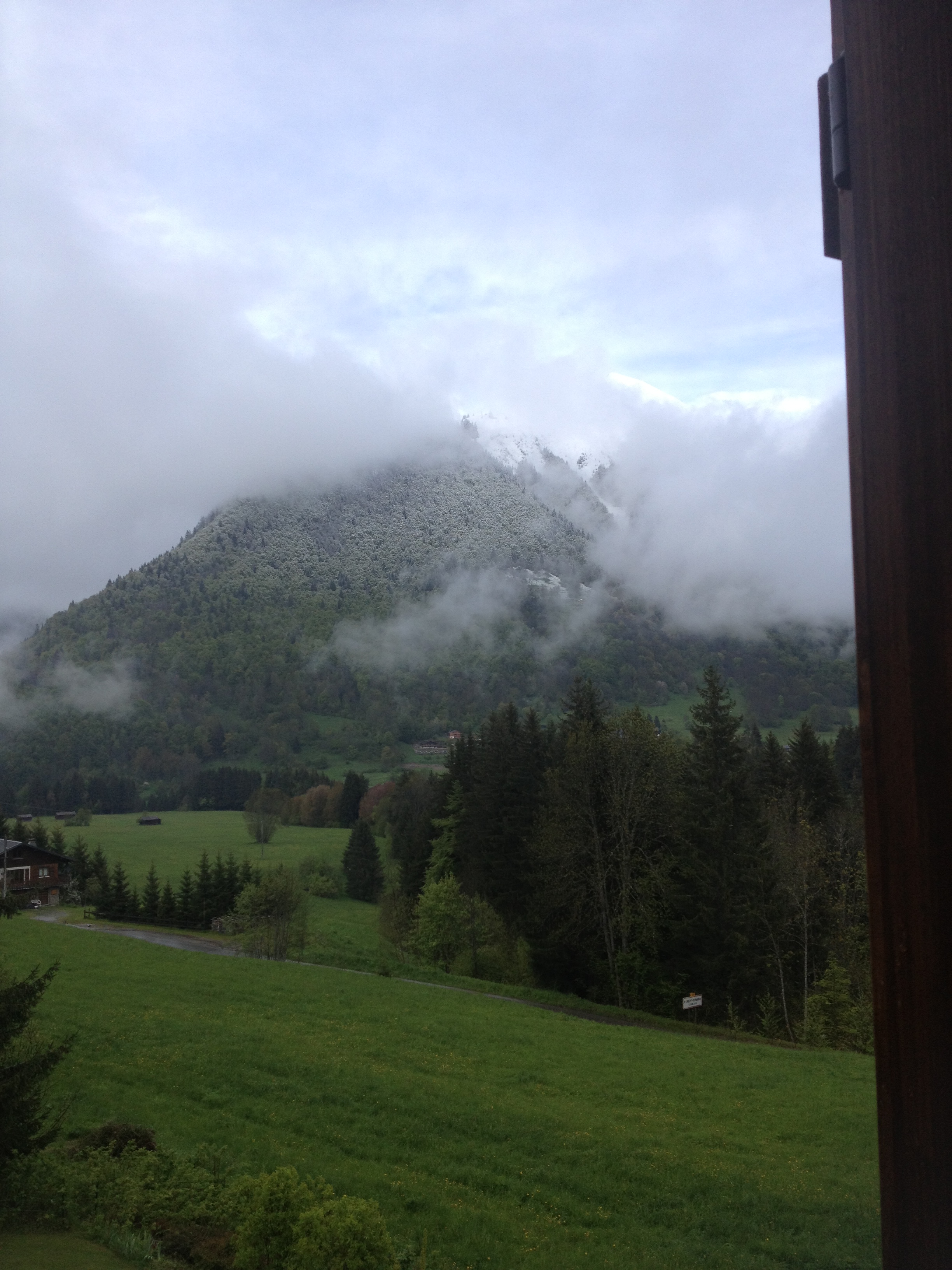 Nantaux covered in snow and shrouded in cloud.