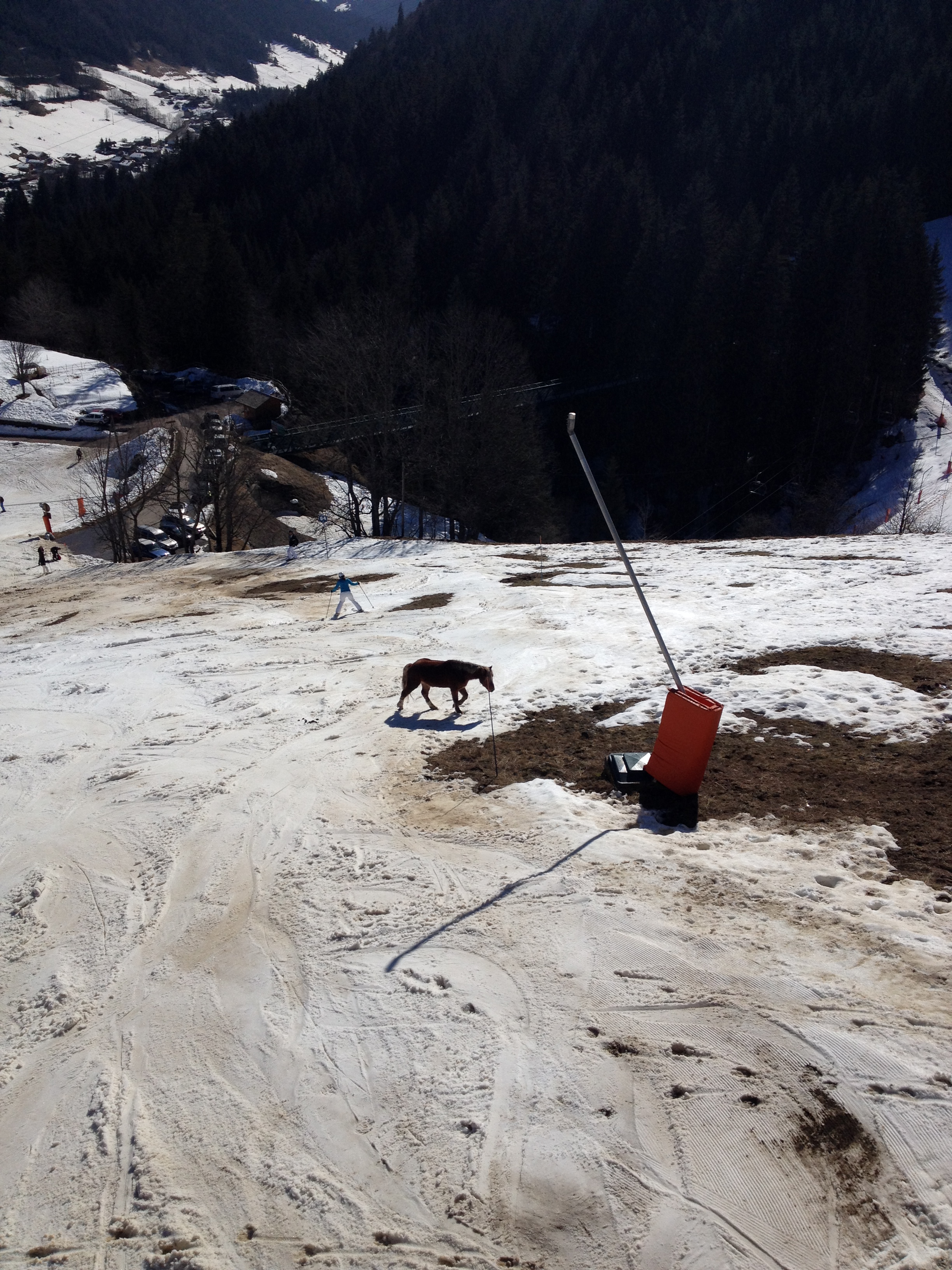 Not everyone seems to need skis to get across the piste, these days. Just going for a stroll in the warm, Spring sunshine with not a care in the world!