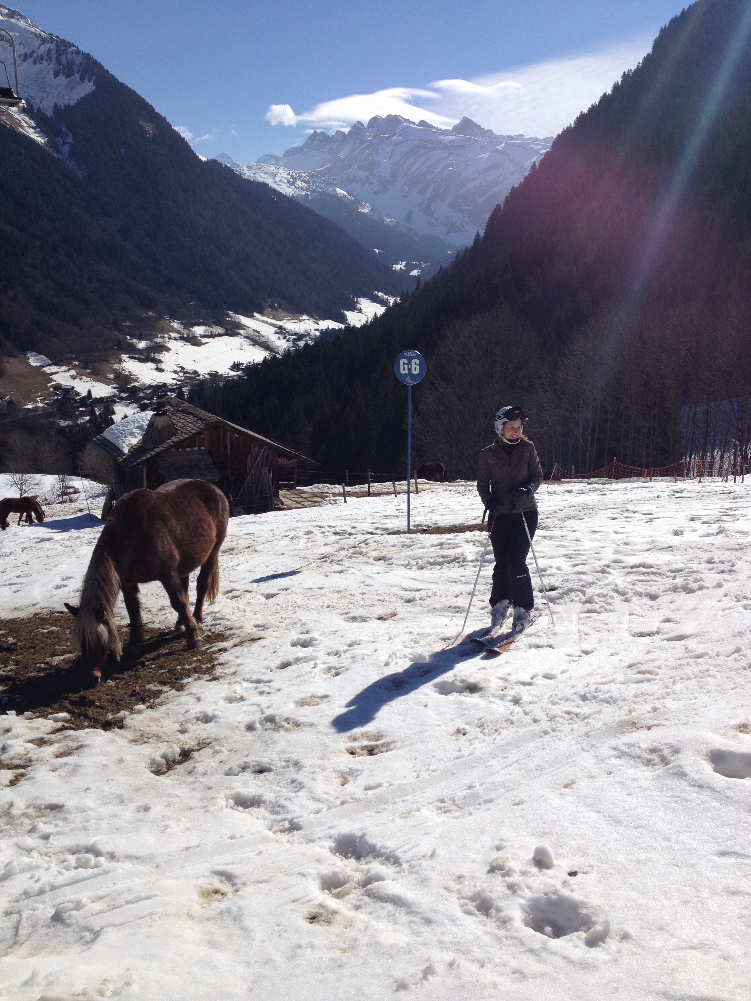 Dawn and Paul were new guests to the chalet. It was a butiful day – warm, Spring skiing. Not sure they were expecting this – Dawn got distracted by one of Morzine’s many horses that stroll around, off the Joux Plane road.