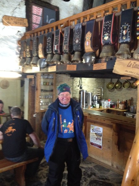 Alan plus authentic cowbells in the traditional Swiss Buvette on the way down to Morgins.
