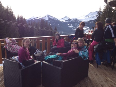 Alison and her girls lounging at the new bar at the L’Passage RR, right by the top of the Super Morzine Bubble. Perfect location in the warm Spring air – great views!!